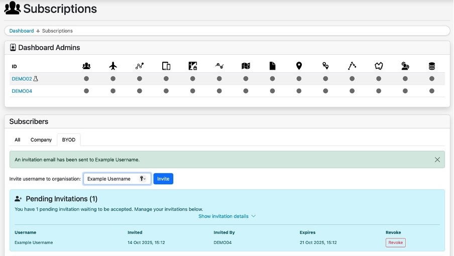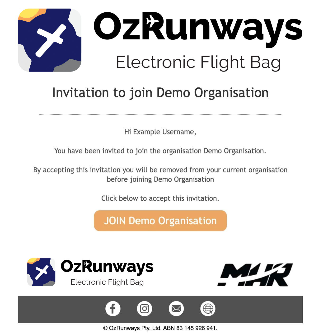 Input the username of the OzRunways subscriber and select “Invite” to send an invitation to their email, which they will have 7 days to accept.