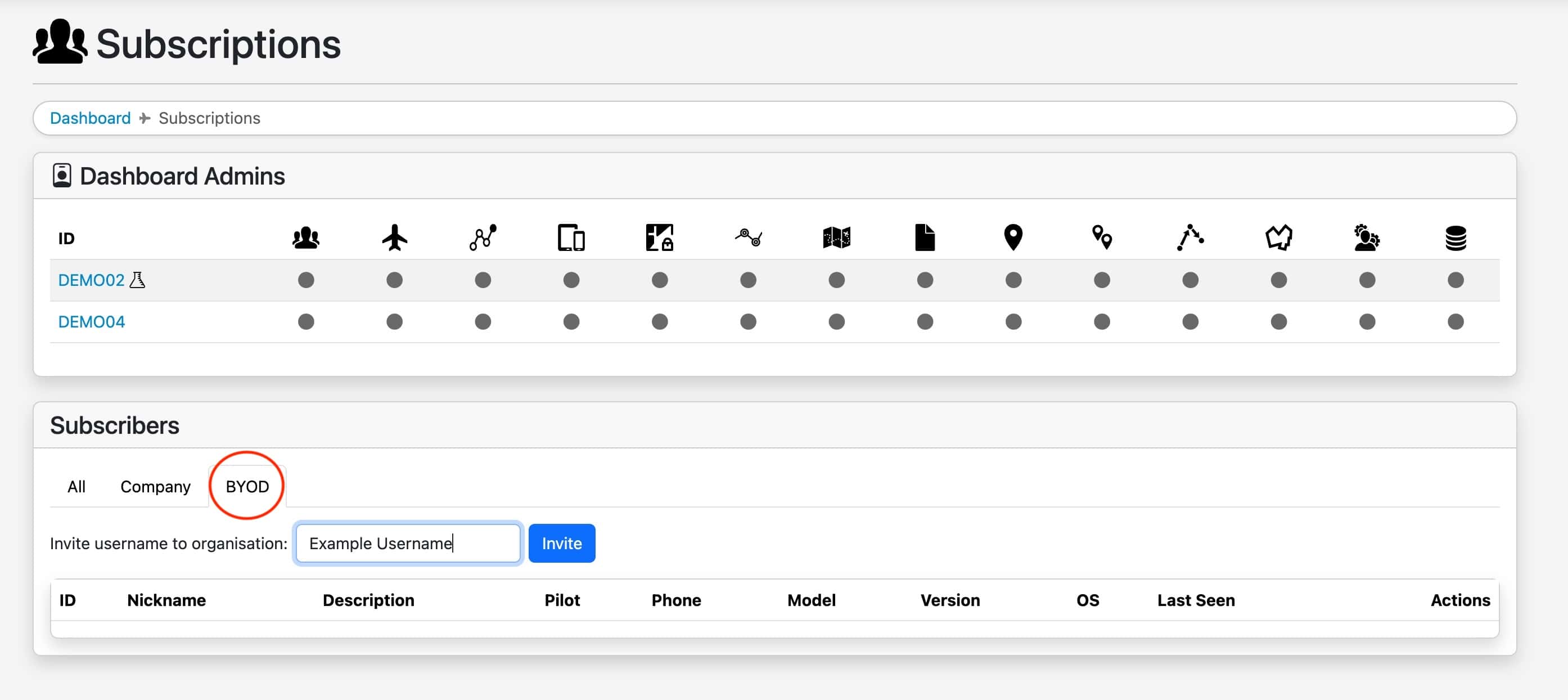 On the Subscriptions page, you will see tabs separating company accounts with BYOD. Select the BYOD tab.