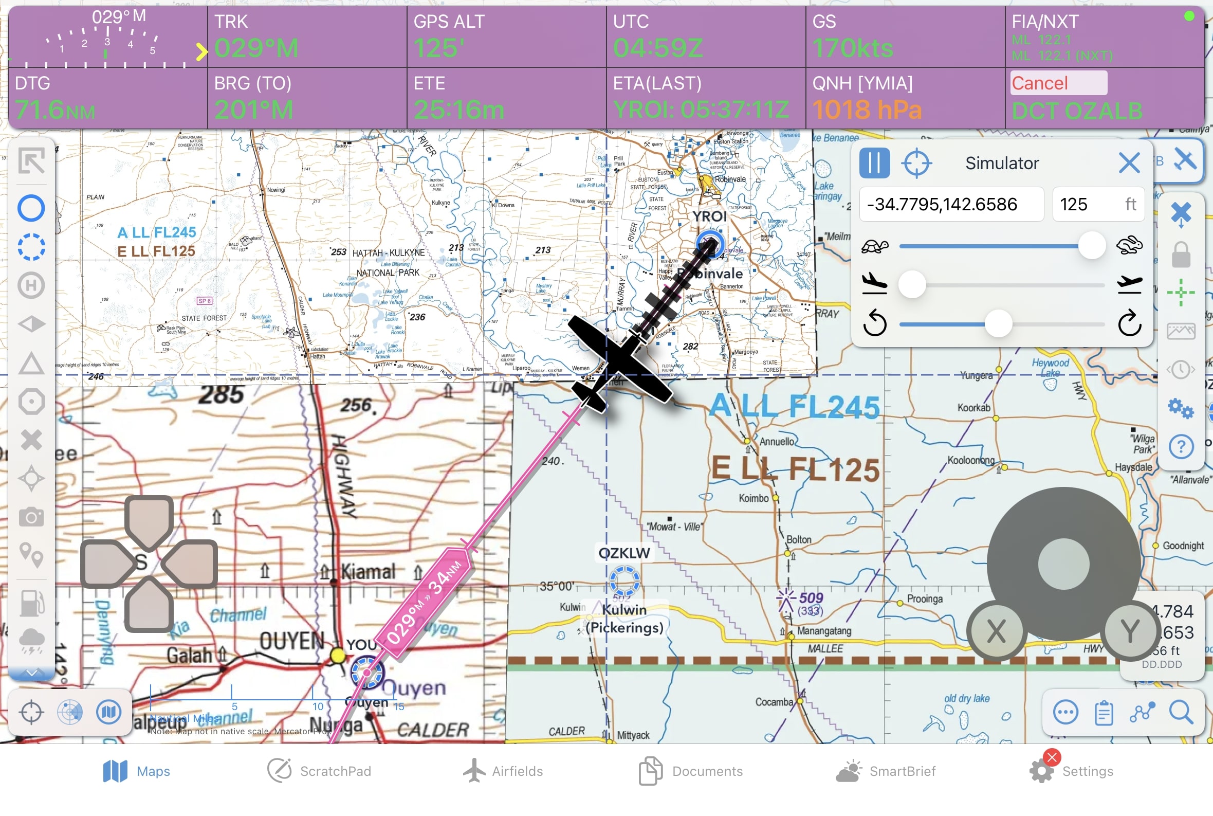 Simulator Mode’s in-app controls let you fly a fully simulated aircraft directly within OzRunways, with no external flight simulator required. The three sliders can be used to adjust speed, climb/descent rate, and turn direction. When the cursor is enabled, you can instantly reposition your aircraft by tapping on the target symbol — the aircraft will move to the crosshair. You can also manually set position and altitude by typing values into their respective fields.
