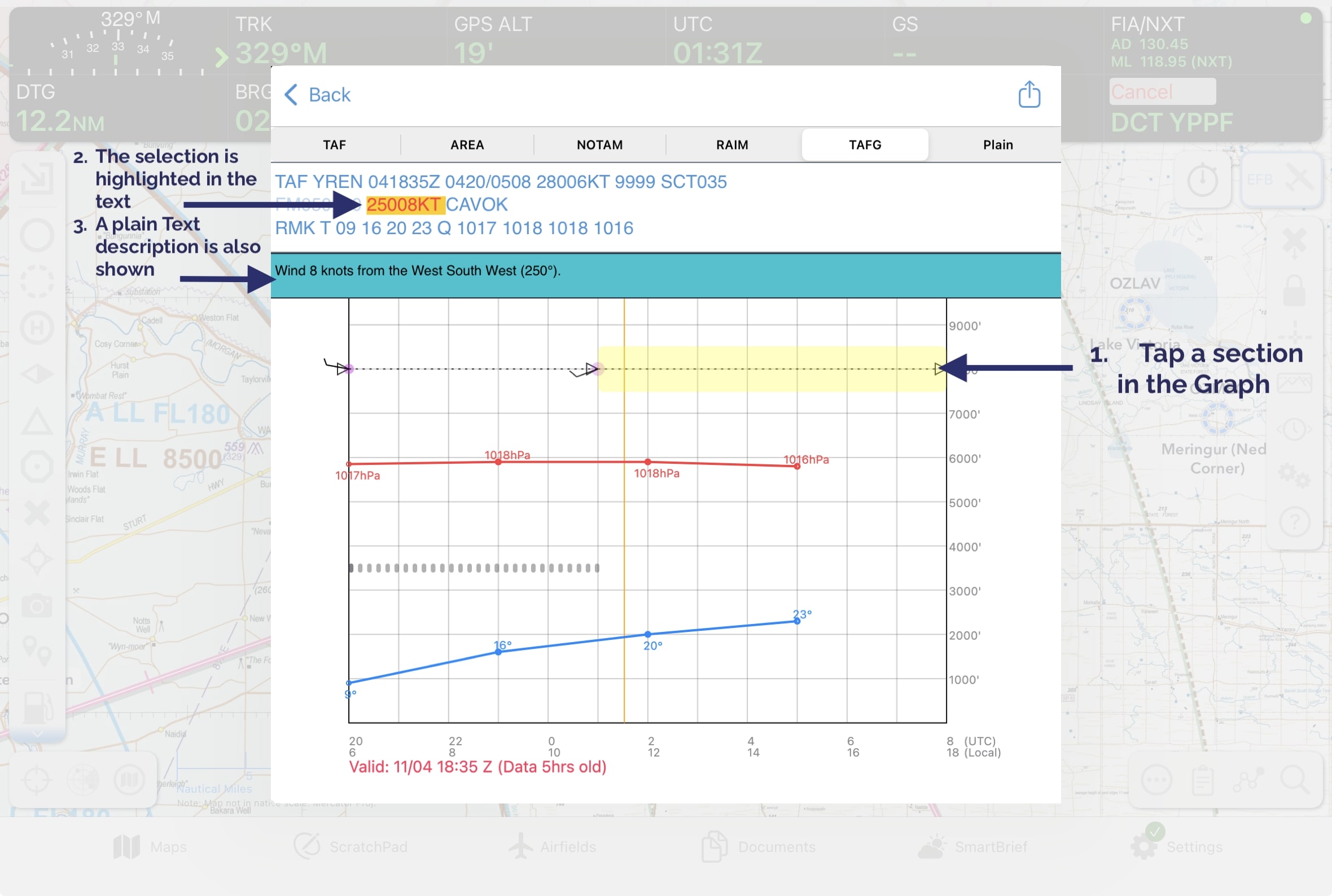 If there is a TAF for the selected location then this tab will display a graphical version (TAFG or TAFGRAF). In the TAFG display, the textual TAF is displayed in a scrollable window above the graphical TAF. Tapping on a graphical element will highlight the corresponding text in the TAF and popup a plain text explanation momentarily at the top of the graphical TAF window.