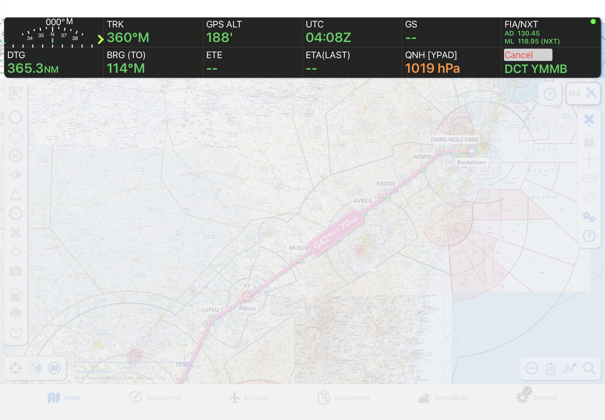 When you begin to plan, the GPS HUD converts to a two row display. The plan is now active and if desired can track your position on the map and update the GPS HUD fields with information such as Track, Ground Speed, Distance To Go, etc. The far right bottom box is the ‘Cancel’ box which, if tapped, will exit the current plan. By default only a single tap is required, however there is an option in the Preferences section of the Settings page called ‘Double-tap HUD’ which when enabled requires a double tap on the Cancel button. This can be handy for turbulent conditions.