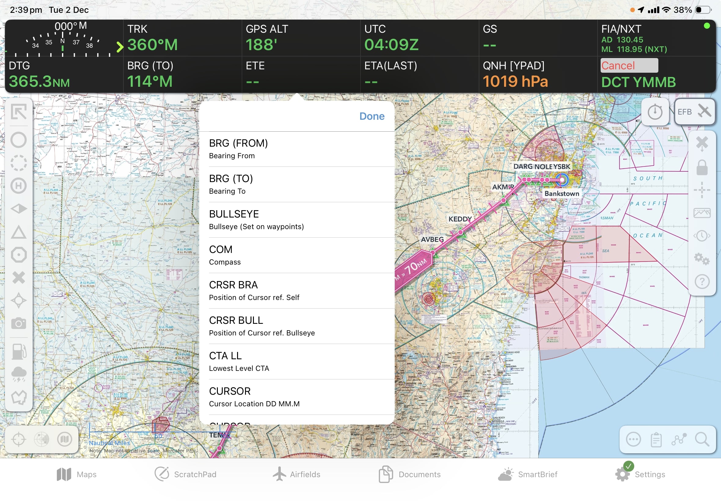 Great Circle Bearing to the next waypoint. When this option is selected the app will display the Great Circle (curved) track for your plan as a grey dotted line, in addition to the standard magenta track.
